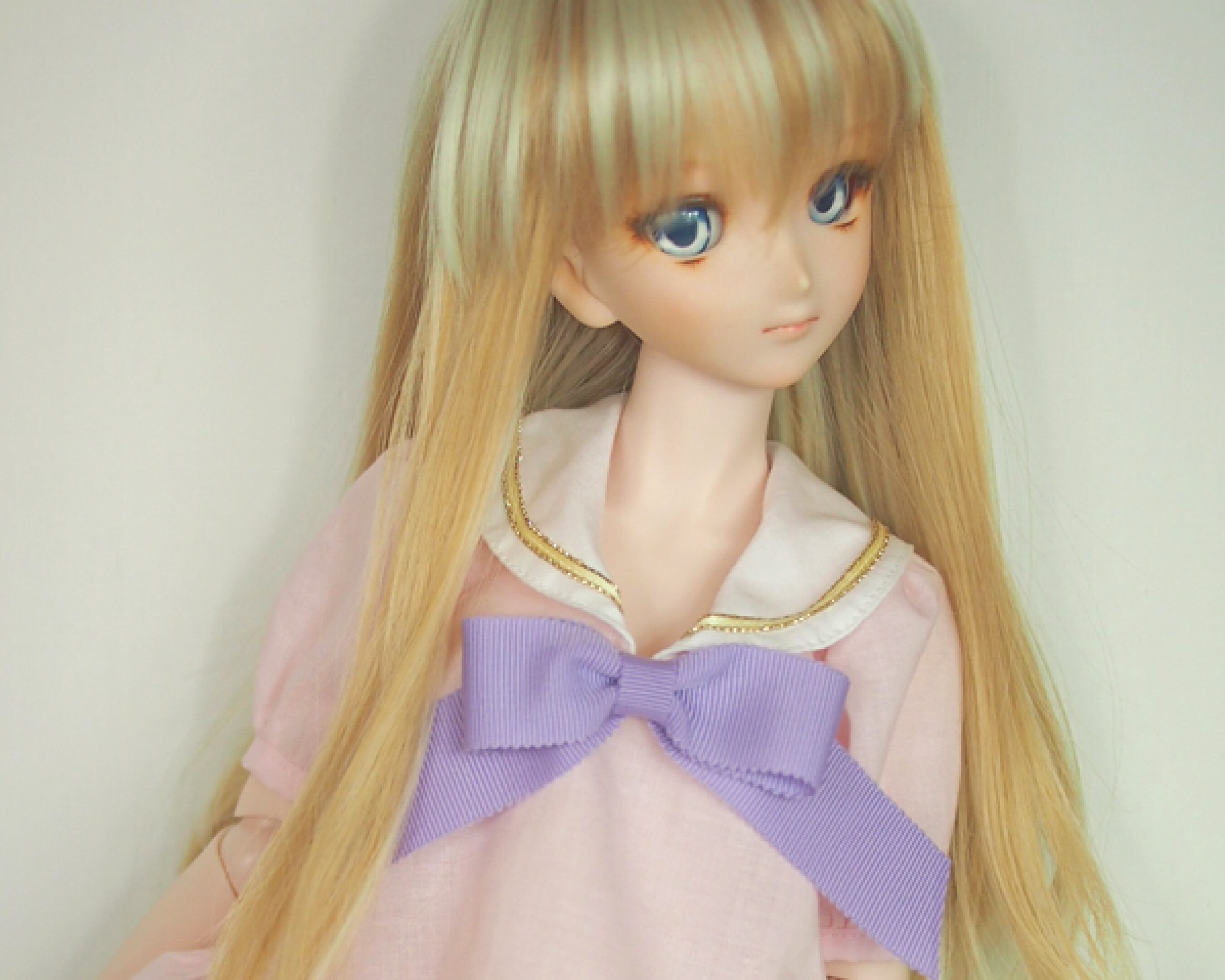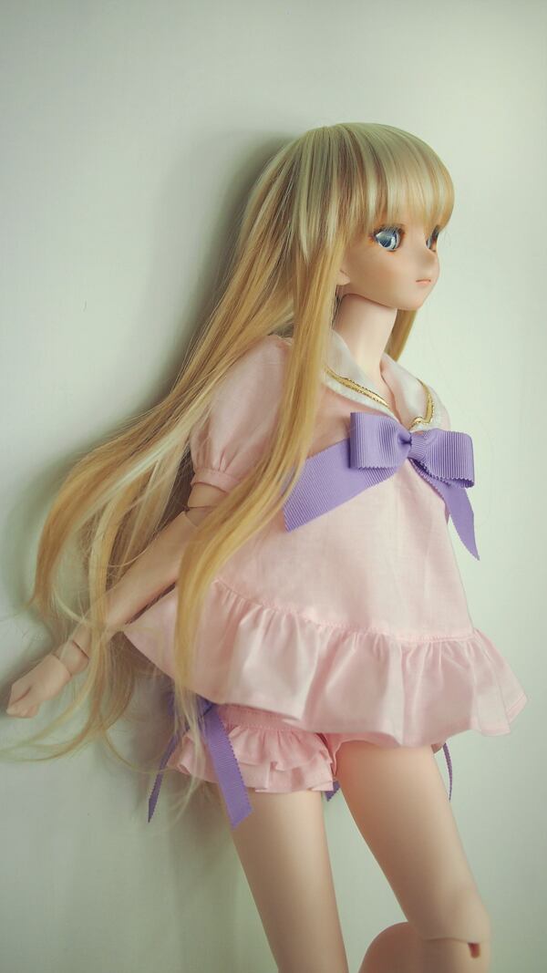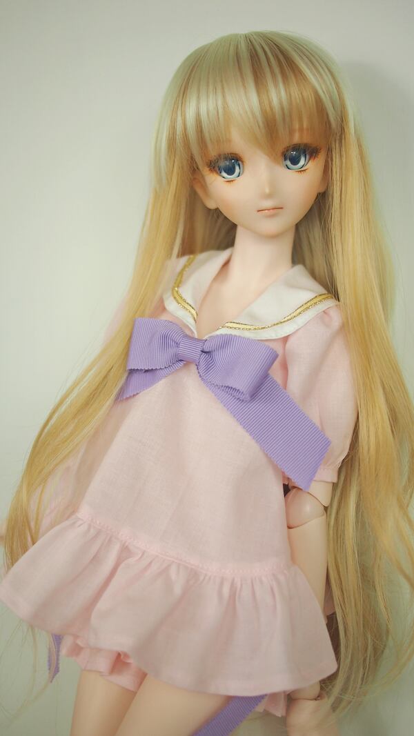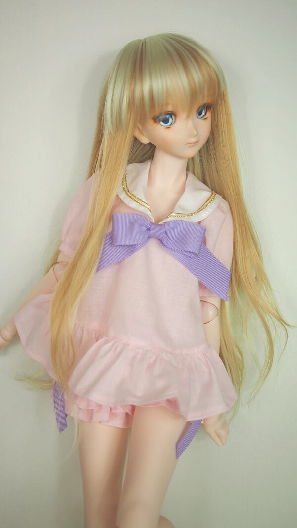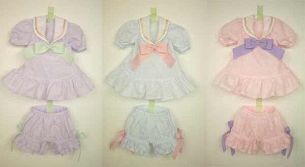 セーラーブラウスは、パステルカラーのローン生地に、パステルカラーのグログランリボンを合わせて、女の子らしさを出しました。大きめのパフスリーブにブラウスの裾もフリルにして、より女の子らしくしました。