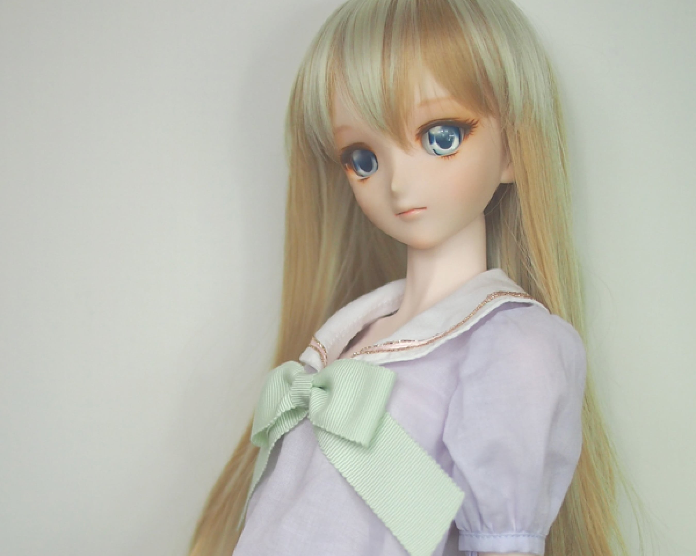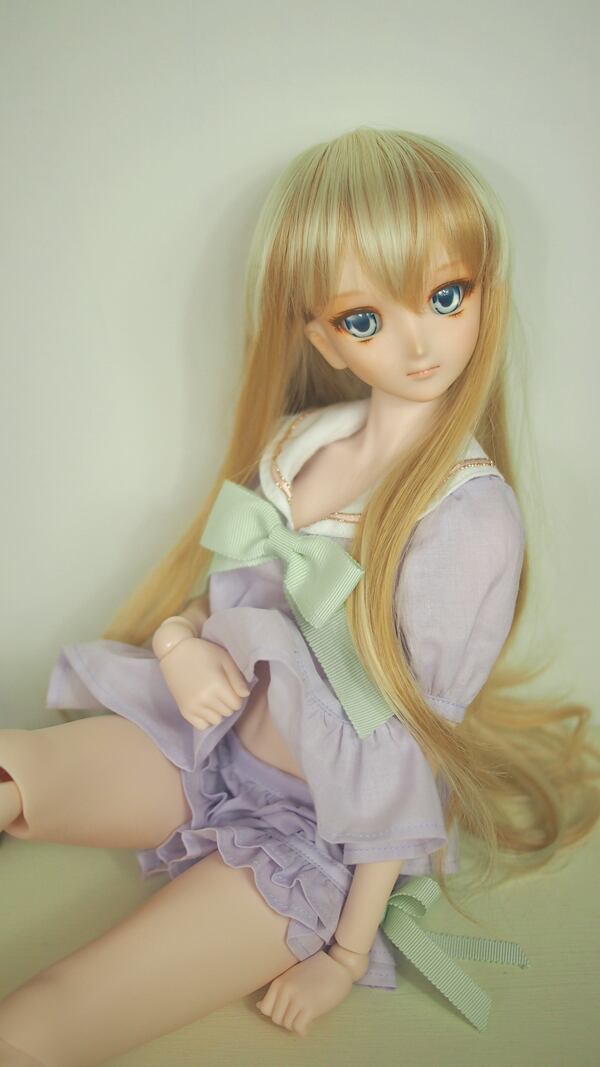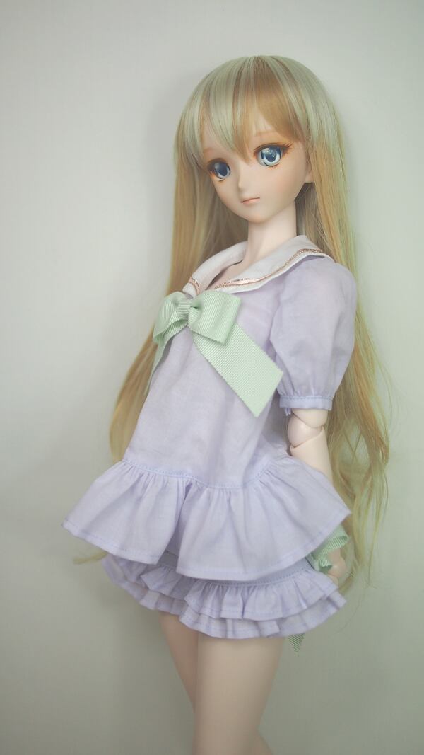 セーラーブラウスは、パステルカラーのローン生地に、パステルカラーのグログランリボンを合わせて、女の子らしさを出しました。大きめのパフスリーブにブラウスの裾もフリルにして、より女の子らしくしました。