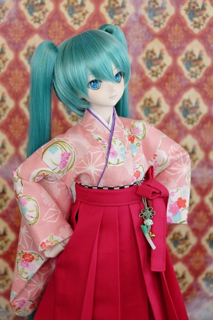 着物部分は、可愛らしいデザインの和柄のアムンゼン生地で、正統派の和風な着物に仕立てました。半襟は紫色でアクセントを。