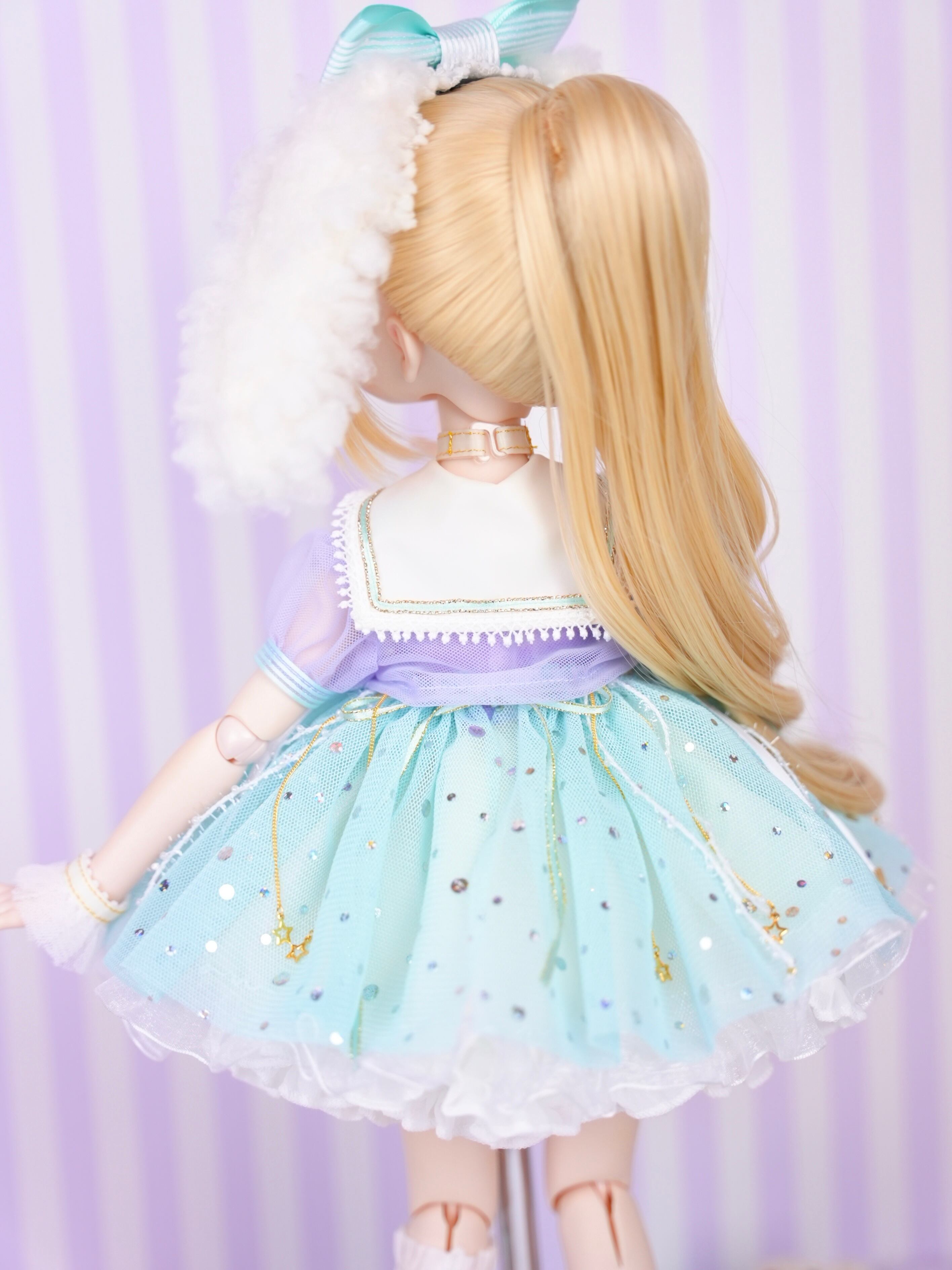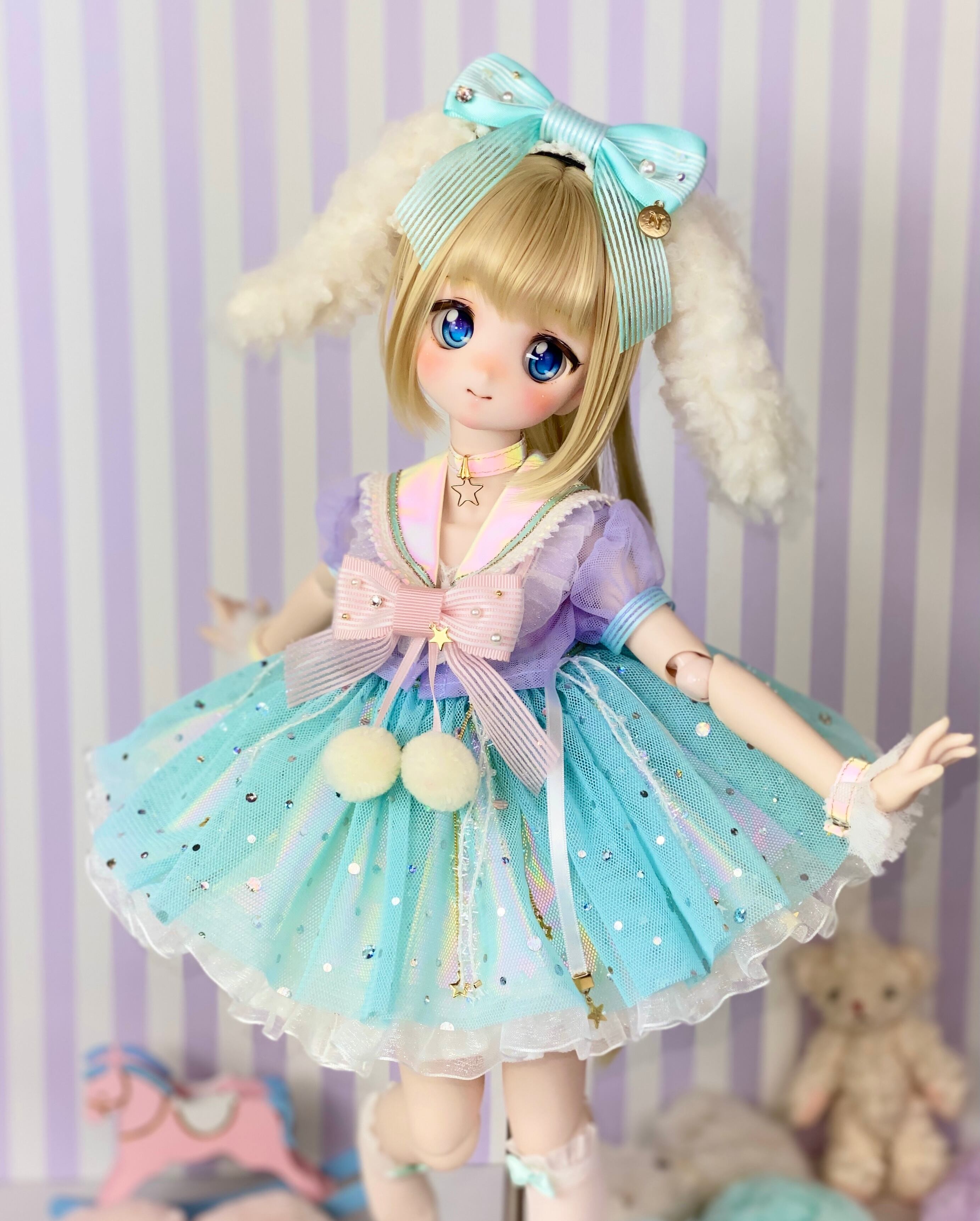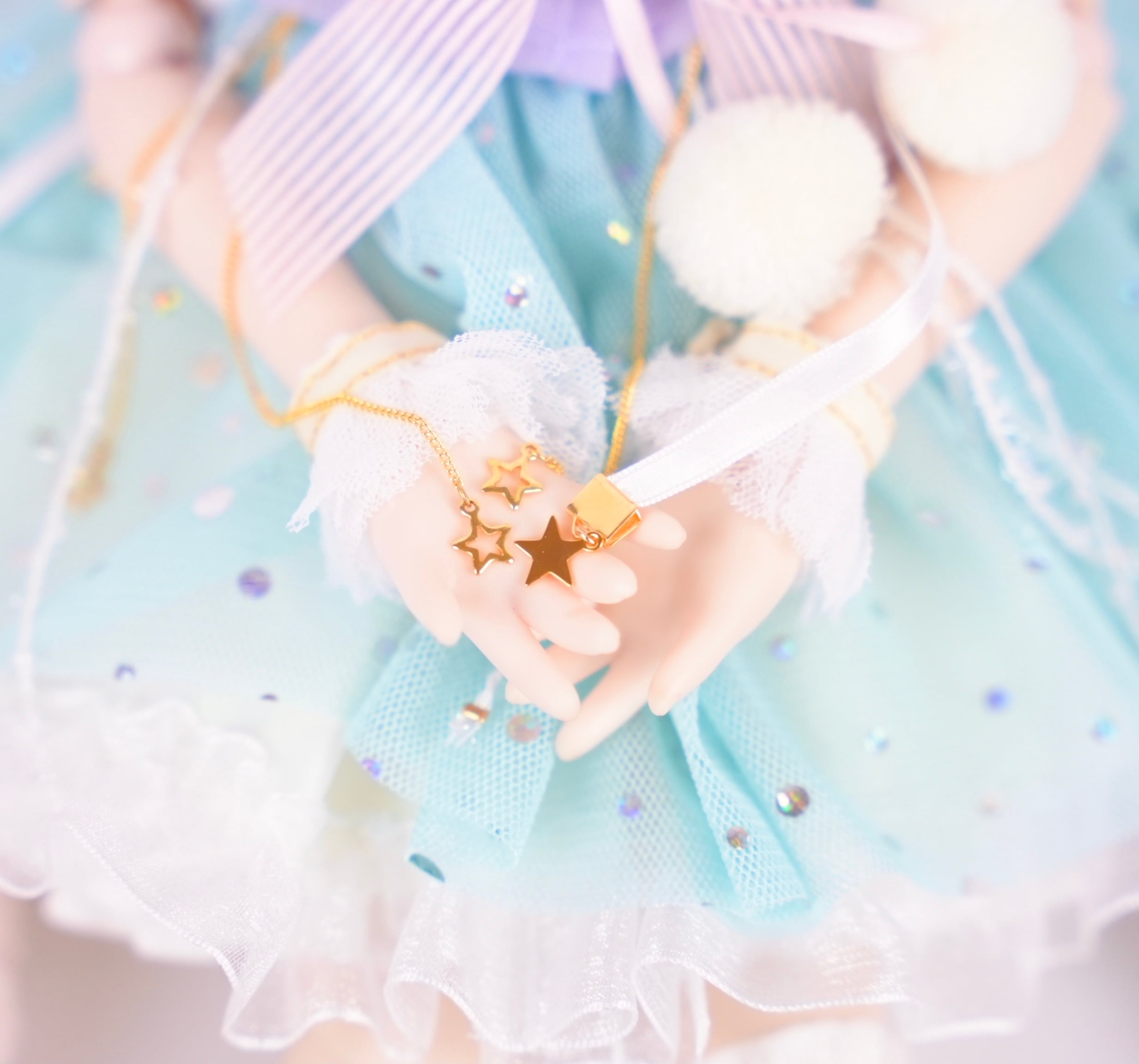 正面のリボンタイにはビジューや星のチャーム、ビーズなどでキラキラを演出しております。