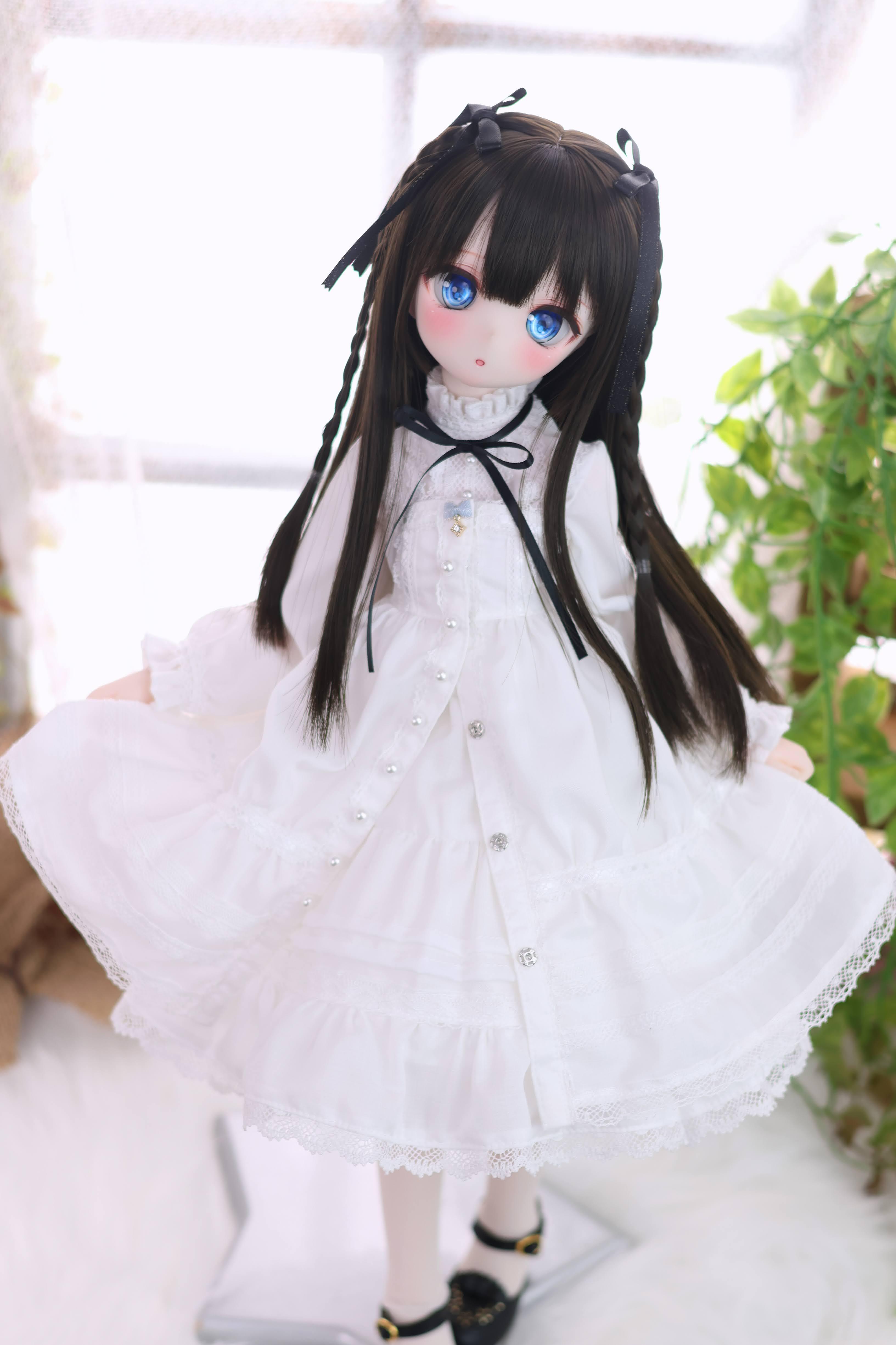 The dress is made from a smooth, wrinkle-resistant fabric and adorned with plenty of lace and ribbons, resulting in a classic yet slightly luxurious white dress.
